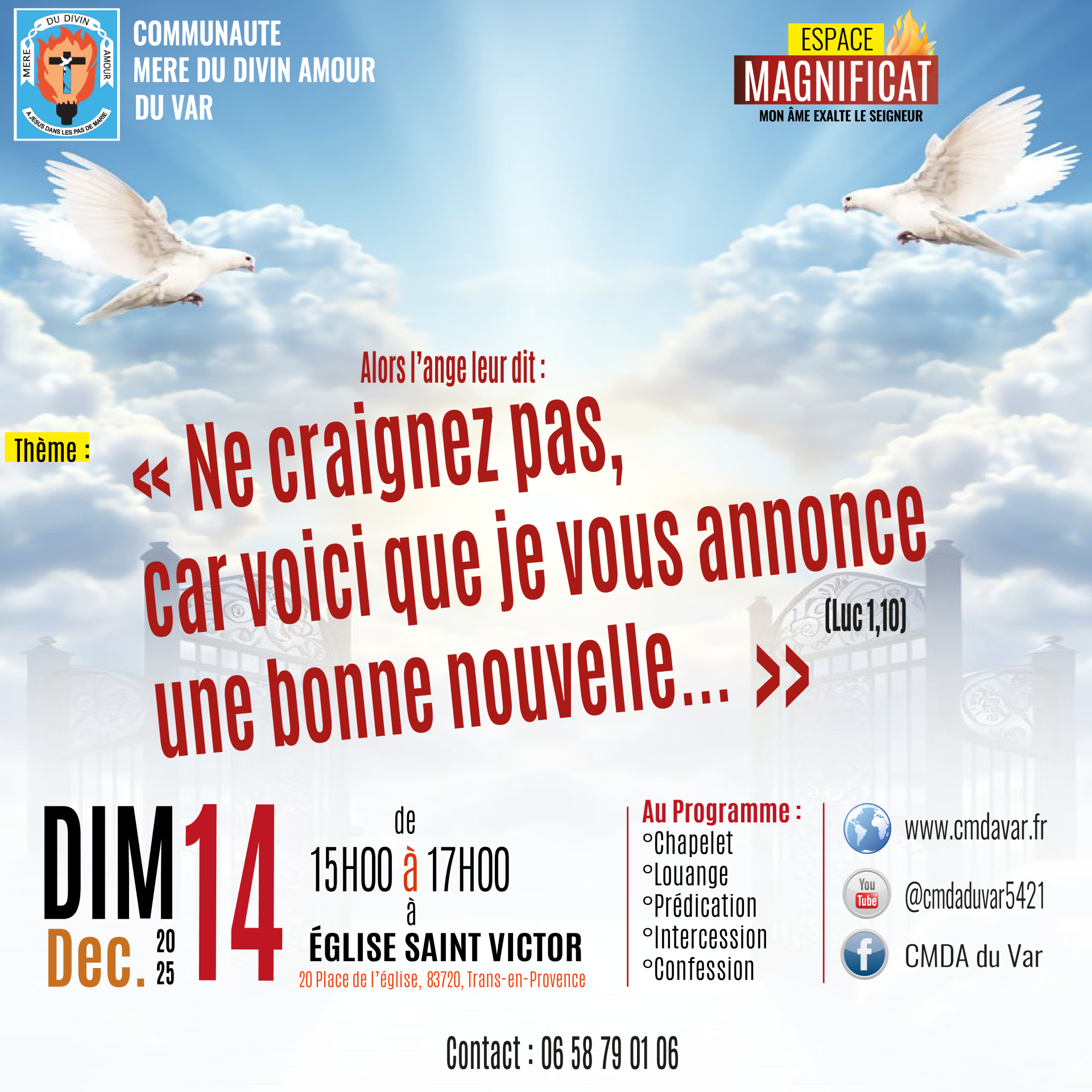 Organisé par la communauté Mère du Divin Amour du Var, l’Espace Magnificat se tient chaque deuxième dimanche du mois, à l’exception des mois de juillet, août et septembre, pour permettre à tous de vivre cette expérience dans la régularité et la joie.